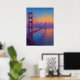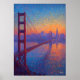 Colorful pointillist painting of San Francisco featuring the Golden Gate Bridge glowing above the bay at sunset. Thousands of vibrant dots create a luminous neo-impressionist cityscape with shimmering water reflections and a radiant skyline atmosphere.