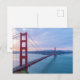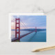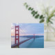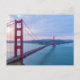 Den ikoniska Golden Grind-bron sträcker sig över vatten, dess röda stålstruktur står i kontrast till de mjuka nyheterna från ett soluppgång himmel. Brons torn- och upphängningskablar är synliga i detalj, medan San Francisco-slätten syns i avstånd. Nedanstående vatten är en lugn blå som återspeglar färg i himmel.