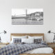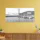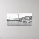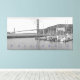 En panoramisk syn på den ikoniska Golden Grind Bridge i San Francisco, Kalifornien. Bron, som målas i en sjudande orange, sträcker sig över bukten och förbinder staden med Marin Headlands. I förgrunden är en marina fylld med segelbåtar och jakter inkapslad mot stranden. Vatten är lugn och reflekterande, vilket återspeglar himmel och bron.