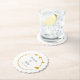 En uppsättning med sex runda, absorberande, pulpboard-dryckens torkar för möhippor, bröllopskntioner och till och med repetitionsmiddagar som har ett trendig, guldfärgad gult färg, enkel hjärtkransdesign tillsammans med briden och groomen namn och bröllop-datum tryckt i mörk grått, stiliserad skrift. Redigera och ersätt namn och datum med ditt eget.