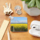 Ett fält av det ljusa gula blommor sträcker ut sig under ett delvis grumligt himlar, med berg synliga i avstånd. Ett trästängsel i förgrunden gör att landskapet påverkas rejält. Bilden togs nära Ararat i Victoria, Australien.