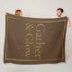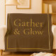 The Golden Hearth Gather fleece blanket features a cocoa brown base with a subtle gold border and serif text that reads Gather & Glow. Its warm neutral palette pairs easily with seasonal décor, making it a soft layer for winter evenings, living room lounging, or holiday home accents.
