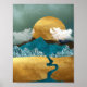 Ett slående abstrakt poster med ett gyllene sol som stigning bakom djärva blå berg, som står i kontrast till skuggande struktur och flytande guldfält. Vita fåglar skjuter över det grumliga himmel, vilket ökar rörligheten och lugnet på scenen. Sammansättningen blandar naturligt och surrealistiskt inslag och skapar ett modernt, lyxaktigt estetiskt, som känner sig både lugnande och mäktigt. Perfekt för älskare av fet färg kontraster och contemporary naturinspirerad konst.