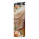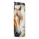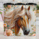 A stunning golden-brown horse with a long, flowing blonde mane is elegantly framed by delicate pink and white blossoms and lush green foliage. The soft lighting and painterly style create a serene and graceful portrait, celebrating the gentle beauty of horses in a springtime setting.