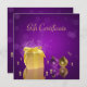 Glamorös magisk julillustration: Glamlande gyllene presentlåda bredvid guld och lila julgran bollar och guldpärlor på elegant lila med båge.