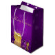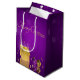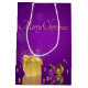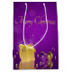 Glamorös magisk julillustration: Glamlande gyllene presentlåda bredvid guld och lila julgran bollar och guldpärlor på elegant lila med båge.