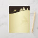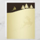 Julillustration i elegant guld med en gyllene silhuett av en renare och träd med God jul hälsning på brunt underlag.