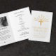 Begravningsprogram med guld på omslaget med ett kor omgivet av guldstrålar. Att fira ditt älskade liv. Lägg till ett foto av dem i det uppspelade begravningsprogrammet tillsammans med en obituary och serviceordningen i svart brev mot en ren vit bakgrund. Du kan också lägga till bekräftelser eller en dikt eller en bön på baksidan, även tryckt med guld folie.