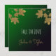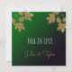 Kvadratiskt inbjudningskort med gyllene löv i en bakgrundsbild för nödövertoning. Det kommer med texten "Fall in Kärlek". Inbjudningar eller tillkännagivanden om snyggt till bröllop på hösten eller under Båda sidor ska anpassas! Malldesign av Alma Wad