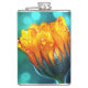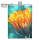 Golden orange marigold blöt med dagg mot bakgrunden av tealborst