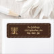 Den här returadressetiketten har en gyllene menorah på en chokladbrun färgad och bakgrunden är ljus och mörk brun diagonal rand. Texten på den här etiketten kan anpassas och användas antingen som en returadressetikett eller som en märkre.