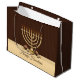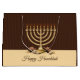 Här har vi en underbar presentväska som har en gyllene menorah sitta på en bord på en ljusbrun och mörk brun lodrät som är strimlad bakgrund. Texten på väskan med texten "Lycklig Hanukkah" kan tas bort eller anpassas för mottagaren. Den här väskan är en matchning mot andra presentpåsar, som slår pappra, vävnadspapper och ett hälsningskort! Det kommer att göra en perfekt till din gåva till dina vänner och din familj den här julhelgen.