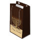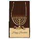Här har vi en underbar presentväska som har en gyllene menorah sitta på en bord på en ljusbrun och mörk brun lodrät som är strimlad bakgrund. Texten på väskan med texten "Lycklig Hanukkah" kan tas bort eller anpassas för mottagaren. Den här väskan är en matchning mot andra presentpåsar, som slår pappra, vävnadspapper och ett hälsningskort! Det kommer att göra en perfekt till din gåva till dina vänner och din familj den här julhelgen.