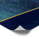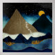 Ett abstrakt med ett unikt färg och struktur som visar en nästan tidsinställd bergscen med det glödande ljuset av klättrar och ett måne i skuggor av blått, guld, cyan och gult.