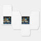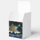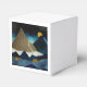 Ett abstrakt med ett unikt färg och struktur som visar en nästan tidsinställd bergscen med det glödande ljuset av klättrar och ett måne i skuggor av blått, guld, cyan och gult.