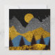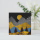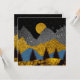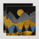 Abstraktens landskapsplanering i fet guld, svart och blå med månghund och fåglar.