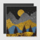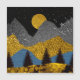 Abstraktens landskapsplanering i fet guld, svart och blå med månghund och fåglar.