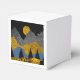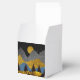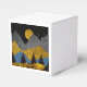 Abstraktens landskapsplanering i fet guld, svart och blå med månghund och fåglar.
