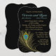 Elegant och modernt stil, golden peacock Fjäder design över en svart bakgrund, bröllopsinbjudan.