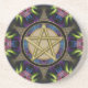 Psychedelic colourful fractal art in vibrant pinks, blues and purple with golden pentacle in the centre.