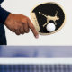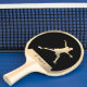 En gyllene ping-pong-spelare på en svart bakgrund utför en boll-fångst i en elegant och sportisk förlängningsrörelse. Perfekt för ping-pong älskare, den här paddeln är anpassad med ditt namn och blir din favoritpaddel som en professionell-spelare.