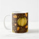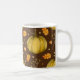 En festiv mönster av guldpumpor, orange löv och hjärta och faller bär på bruna bakgrunder.