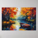 Oljemålning inbjudan har en rik textur, där orangar, strålande och djupa blickar över träd i skarp kontrast till coolans blåsor och gröntar i vatten. Tjock impasto-penseldrag ge gör att det finns en taktil, tredimensionell närvaro, samtidigt som reflexer dansar över flodens yta i ljusa, brutna drag. En solitär båt går fredligt runt i det glättande bladet och ger uttryck för en tyst känsla av ensamhet och koppling till naturens skönhet i vilden. Perfekt för att tillföra värme och lugn till vilket utrymme som helst.