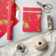 En papper julomslutning med en mönster av guldrenar, klockor vid jul, guld holly med röda jordgubbar och snöflingor vid guld.