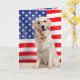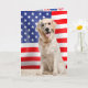 Flaggglasögon på Golden Retriever hund med amerikansk flagg bakgrund för 4 juli.
