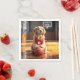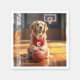 En gyllene hämtare sitter på en golv, med en röd tröja med nummer 5, medan tassar vilar på en basket