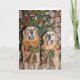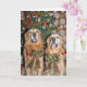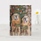 Julkortet har guldladdare som bär julklappade skor sitta framför ett vackert Julgran. Texten lyder: "Hoppas att du får allt du vill för denna jul!"