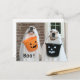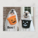 Det här vykortet har två guldkamrerer hundar som är klädd som Halloween spöken! De bär vit lakan och bär med sig orange- och svarta behandlingsfickor med jack- o- lantern ansikte. Texten på framsidan lyder "Boo!" medan texten på baksidan lyder "Har Treats?" Happy halloween!" Anpassadet är fullt ut.