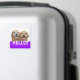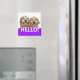 Den här magneten har ett foto av två leende guldladdare hundar, med ord HEJ! på en lila bakgrund.