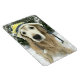 Den här magneten har ett foto av en guldfärgad hund som bär en söt blå hatt och gult när man är utanför snö.