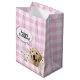 Cute golden hämmare med vita daisy på vit och rosa gingham-bakgrund för födelsedag eller någon annan händelse. Text kan redigeras.
