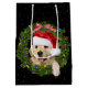 Kute, gyllene husdjur, hund i julkransarna gräs med gingham-båge och glödande ljussträng. Den svarta bakgrunden kan ändras.