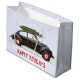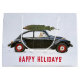 Hund som hämtar gulden och kör en retrosvart bil i snöflingor med grönt jul i träd i gräs på tak. Text kan redigeras.