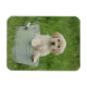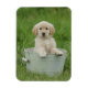 Renrasiga guldvalpar som tar ett bad utomhus i en vintage som tvättar sitta i gräset med färgad i kräm med tass på kant. Hon är en beundransvärd blondin, blondin, färgad baby med brunt öga och en svart näsa.