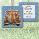 En trio söt Golden Retriever Hundar tittar ut från baksidan av en vintage röd pickup lastbil på denna julprydnad. Lastbil är dekorerat med Helgdag evergreen boughs och en röd båge. Bilden placeras på en blå bakgrund där vitt snöflingor faller runt hela bilden. Baksidan av prydnadsföremålet har samma blå snöflinga gräns med en mittbanderoll som heter "God jul Gott nytt år", och du kan anpassa året.