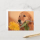 Här är en blomma åt dig! Det här vykortet innehåller ett foto av en söt guldladdad hund som håller en gult blomma i munnen. Kortet är fullt anpassade. Lägg till text framtill och bakåt om du vill. Du kan till och med flytta eller ta bort platshållaren frimärke och lodräts skiljelinje.
