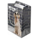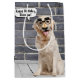 Golden-hämtaren bär en rolig mustasch mask på grått-tegelväggen och trä golv. Kan användas för någons födelsedag. Text kan redigeras.