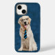 Golden hämmare med slipad nektie och svarta glasögon på blå läderbakgrund. Bakgrunden kan ändras.