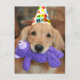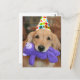 Förgyll någon dag med detta söta vykort! Designen visar en golden retriever hund som bär en födelsedagshatt och håller en lila leksak i munnen. Anpassningsbar text på baksidan lyder, "Hoppas din födelsedag är underbar!"