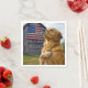 En gyllene karl sitter stolt framför en rustik lada, med en amerikansk flagga på den och en tass på dess hjärta.