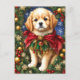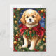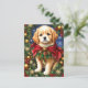 Helgdag vykort med en söt guldkopieringsvalp, klädd i rosett band i ram av fir grenar, prydnadsföremål och snöflingor. "God jul" hälsning på baksidan är anpassade. Besök min butik för mer söt djurkonst.