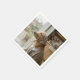 A golden retriever in vintage attire and a floral headscarf gazes wistfully out at the rain.