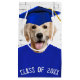 Hund i en blå t-shirt och studentmössa på tegelväggens bakgrund för student. Text kan redigeras.