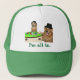 Den här hatten har två gyllene hämtare som spelar pokerspel. Texten lyder: "Jag är med."