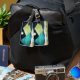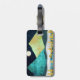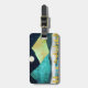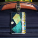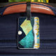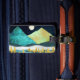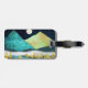 Ett vackert landskap med ett unikt struktur som visar ett flod- och bergslandskap med ett stigning måne och ett stjärnande himlar i skuggor av blått, guld, mörk grönt och gult.