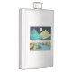 Ett vackert landskap med ett unikt struktur som visar ett flod- och bergslandskap med ett stigning måne och ett stjärnande himlar i skuggor av blått, guld, mörk grönt och gult.